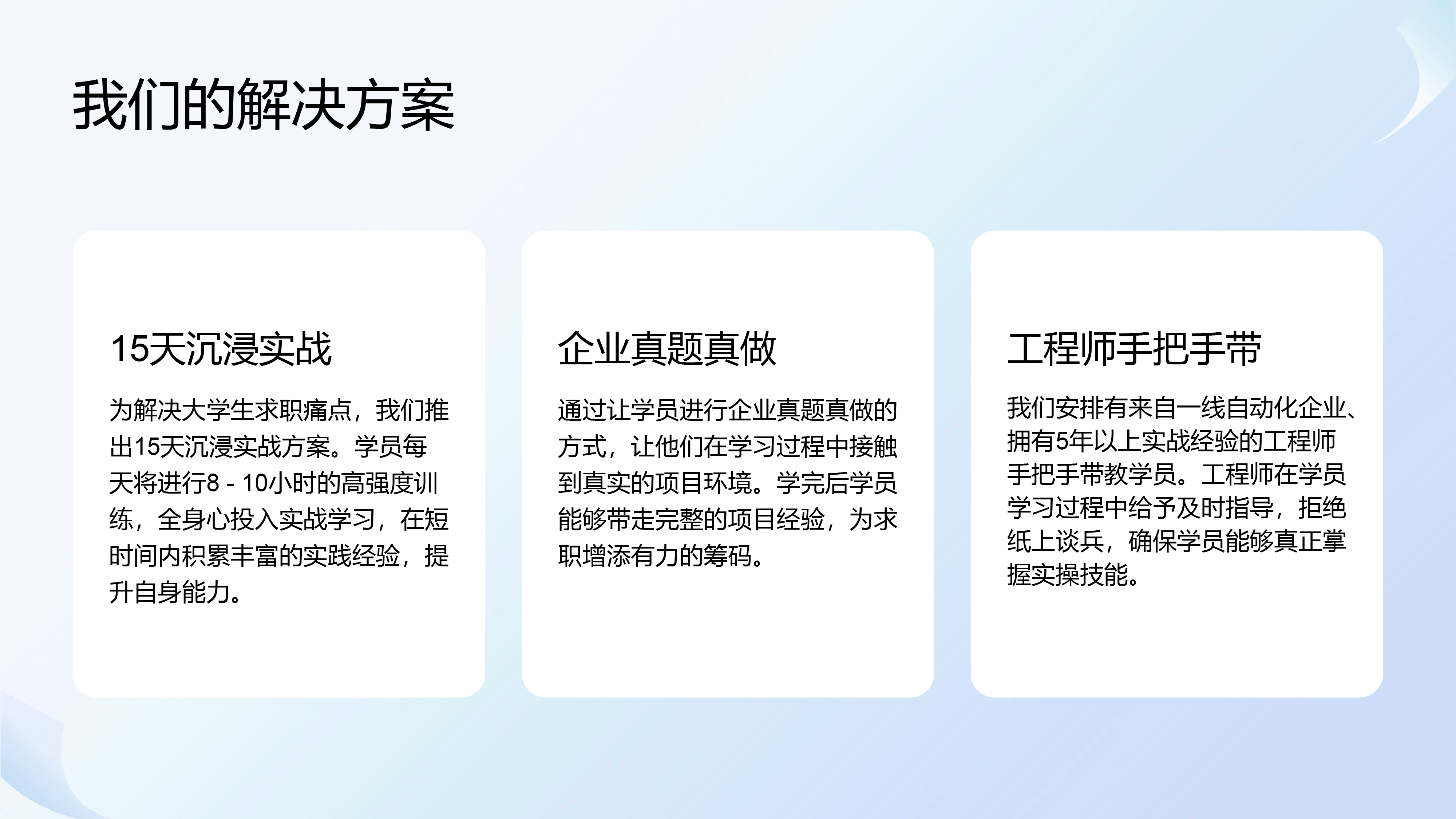 为解决大学生求职痛点,我们推出15天沉浸实战方案。学员每天将进行8 - 10小时的高强度训练,全身心投入实战学习,在短时间内积累丰富的实践经验,提升自身能力。