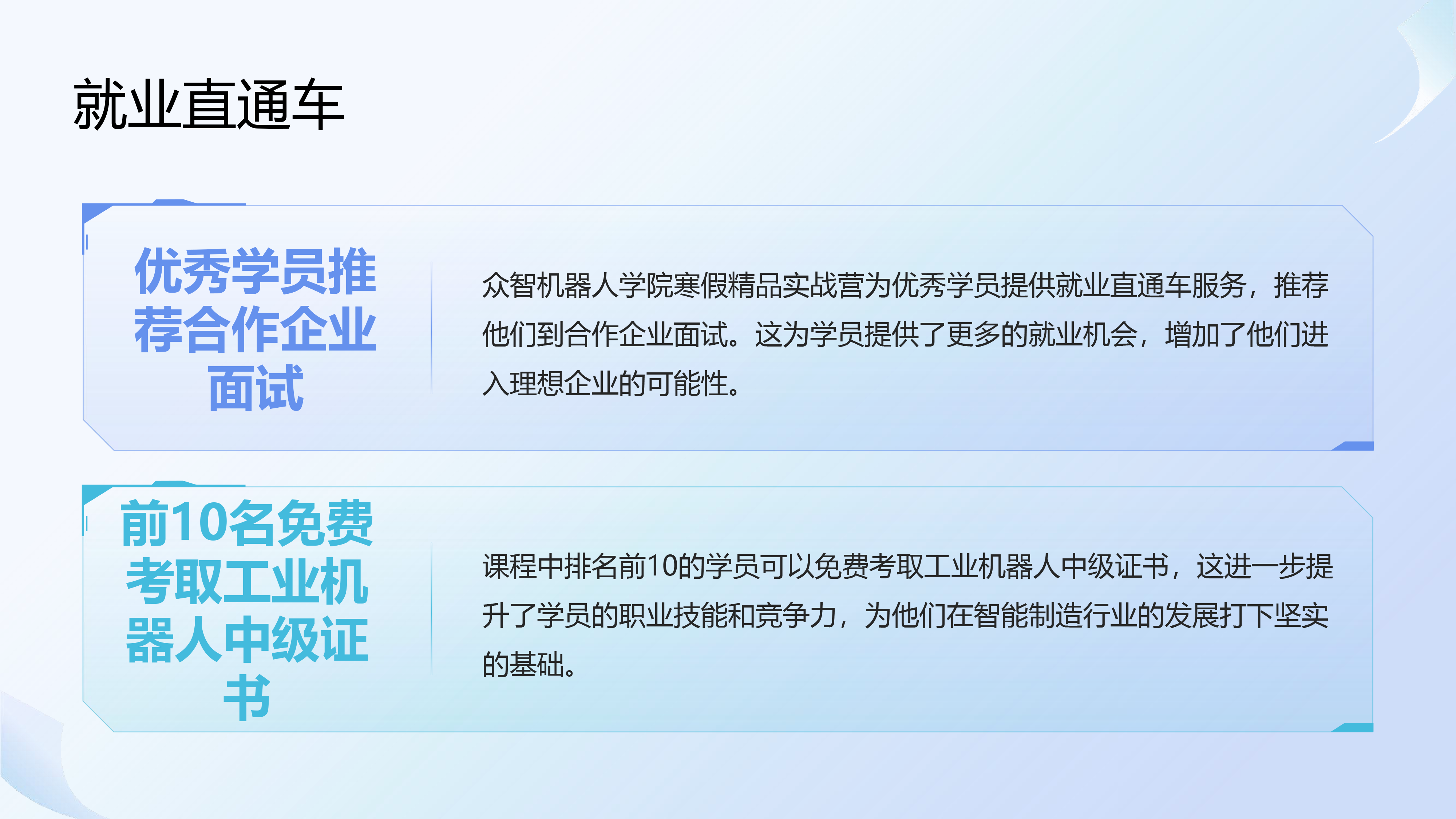课程中排名前10的学员可以免费考取工业机器人中级证书,这进一步提升了学员的职业技能和竞争力,为他们在智能制造行业的发展打下坚实的基础。