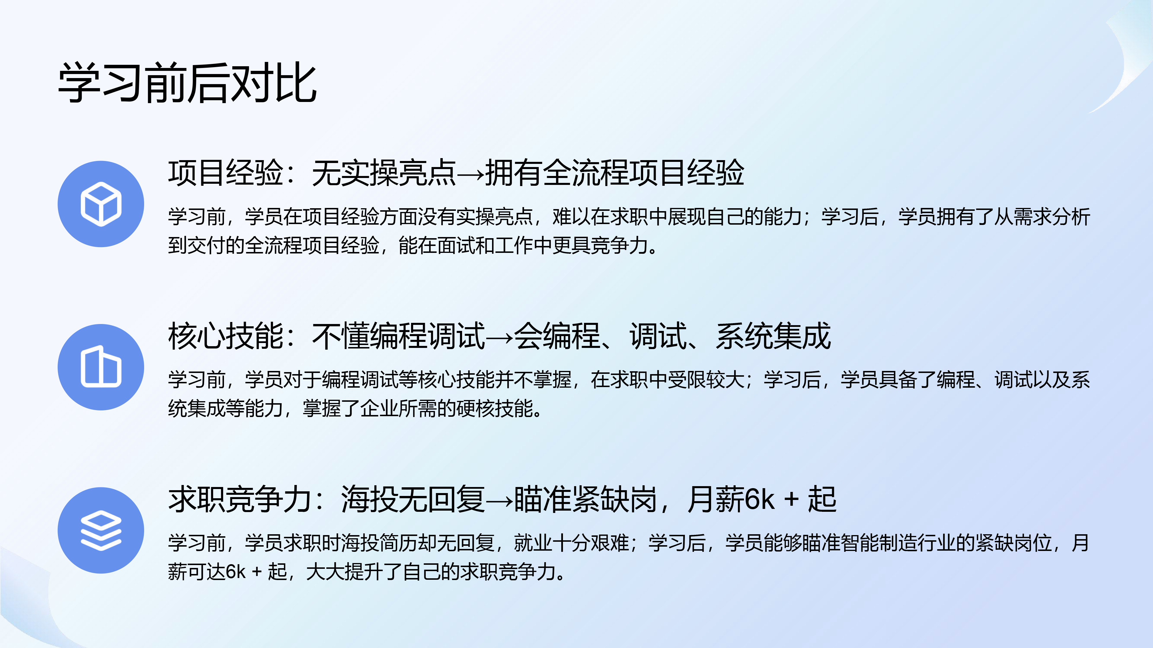 学习前,学员在项目经验方面没有实操亮点,难以在求职中展现自己的能力;学习后,学员拥有了从需求分析到交付的全流程项目经验,能在面试和工作中更具竞争力。