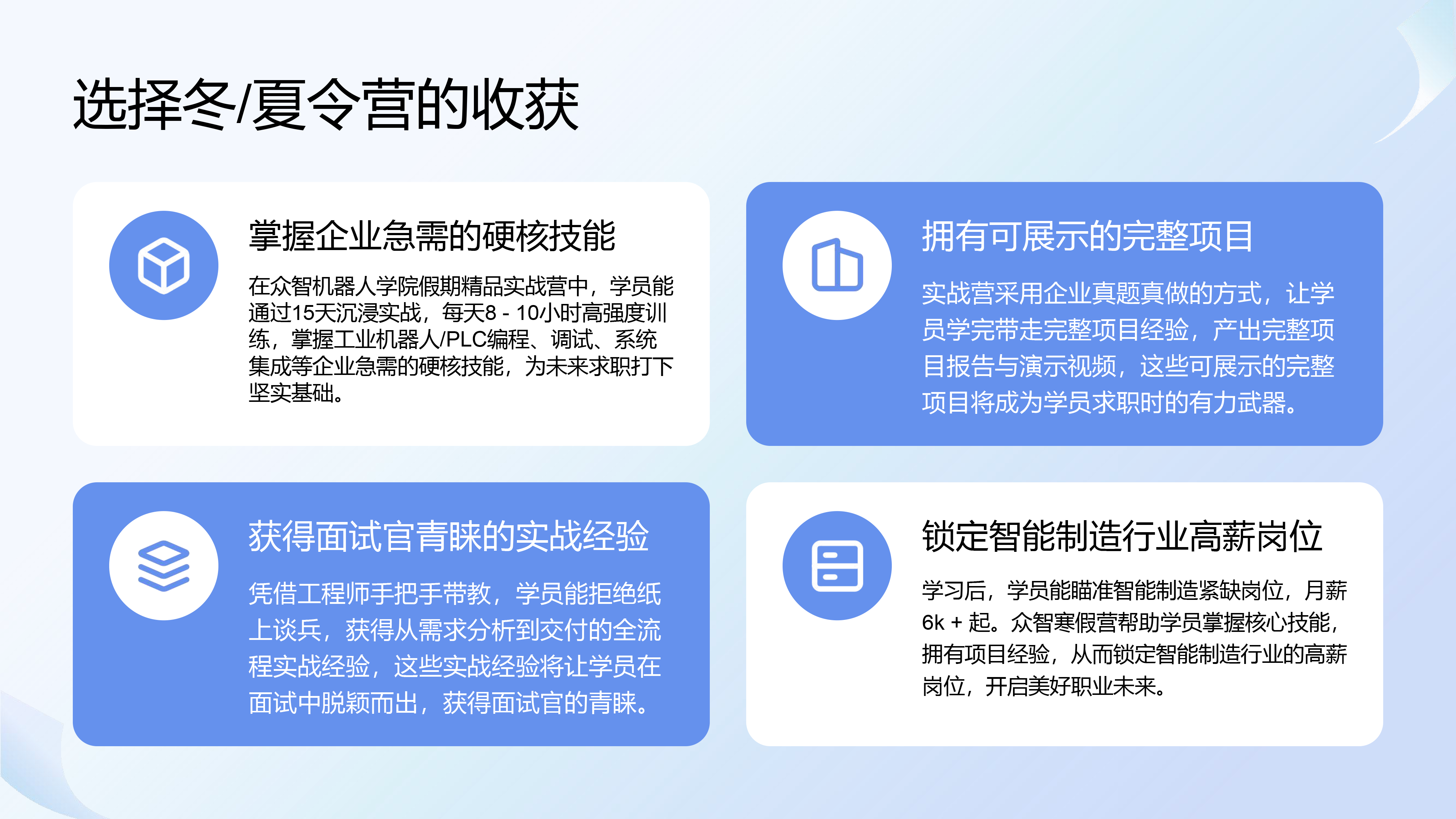学习后,学员能瞄准智能制造紧缺岗位,月薪6k + 起。寒假营帮助学员掌握核心技能,拥有项目经验,从而锁定智能制造行业的高薪岗位,开启美好职业未来。